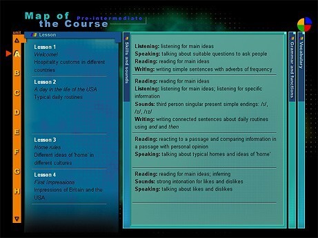 整个系统包括10个学习单元,45个常规课时,每个课时中配有相应的商务案例,案例通过语音和图像的形式呈现。每个常规课时中包含了12至15学习页面,每个页面都包含着相应的学习项目。这些学习项目围绕着商务案例展开。